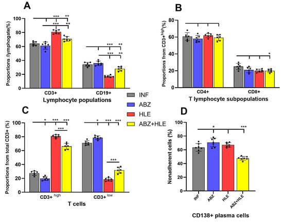 In this study, we investigated whether ABZ, HLE, and their combination modulate the proportions and functions of T and B lymphocytes, as well as plasma cells and plasmablasts, representing up to ~40% of total peritoneal exudate cells (PECs). Non-adherent cells recovered after 18 h of cultivation contained a small proportion of granulocytes, mainly eosinophils, as confirmed by Giemsa-stained smears, reflecting their limited adherence to plastic. Flow cytometric analysis of non-adherent cells revealed that within the lymphocyte gate, the frequency of mature CD3+/CD19−/CD138− T cells exceeded that of CD3−/CD19+/CD138− B1 cells, the main B cell population in the murine peritoneal cavity. Compared to infected controls, HLE and combination therapies led to an increase in total CD3+ T cells (Figure 1A), particularly those expressing high levels of CD3 (Figure 1B). Since the CD3 complex acts as a co-receptor of the TCR [], this suggests enhanced functional activity. Treatment did not affect the proportions of CD4+ helper or CD8+ cytotoxic T cells (Figure 1C).