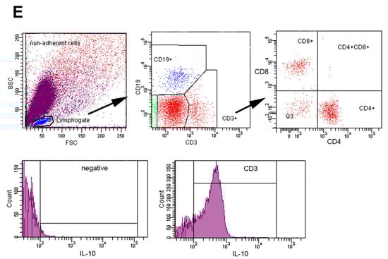 Non-adherent peritoneal cells (0.3 × 106 cells/50 μL) were stained with monoclonal anti-mouse antibodies: CD45.2-PE-Cy7 (clone C.104, eBioscience, San Diego, CA, USA), CD3e-FITC (clone 145-2C11, Invitrogen, Waltham, MA, USA), CD19-PE (clone 1D3, eBioscience, San Diego, CA, USA), and CD138-APC (clone 300506, Invitrogen, Waltham, MA, USA). Other cell samples were stained with anti-mouse antibodies: CD3-PE-Cy7 (clone 17A2), CD4-FITC (clone GK 1.5), and CD8-PE (clone C:53-6.7); all from eBioscience, San Diego, CA, USA). Cells were incubated for 30 min at room temperature in the dark, washed, and analysed using a FACS Canto analyser (BD Biosciences, Franklin Lakes, NJ, USA). For intracellular cytokine detection, cells were permeabilised using the BD Cytofix/Cytoperm Kit (BD Life Sciences, Franklin Lakes, NJ, USA), then stained with anti-IL-10-PE (clone J4S5-16E3, SONY Biotechnology, San Jose, CA, USA) in combination with anti-CD3e-FITC or CD19-APC-Cy7 (clone MB 19-1), both from Invitrogen (Waltham, MA, USA). Data were analysed using FACS Diva software version 9.0 and represent mean ± standard deviation, (SD), (n = 7).