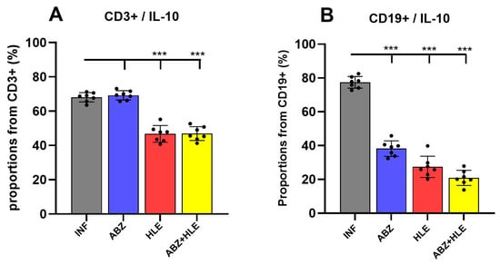 Regulatory B cells (Bregs) and effector B cell subsets differentiation pathways are based on the priming signals received []. Breg-derived plasmablasts and plasma cells, as well as helminth-derived E/S products—particularly those rich in saccharides—can stimulate IL-10 production, promoting both Breg and Treg regulatory activities [,]. Flow cytometric analysis revealed that over 60% of CD3+ T (Figure 2A). In contrast, HLE alone or in combination with ABZ significantly cells in infected mice expressed IL-10, a pattern similarly observed following ABZ treatment (reduced the proportions of IL-10+ CD3+ T cells (p < 0.001), indicating attenuation of Treg-mediated suppression. Similarly, IL-10–producing CD19+ B1 cells were significantly diminished in all treated groups compared with infected controls (p < 0.001) (Figure 2B), suggesting suppression of infection-induced Breg responses.