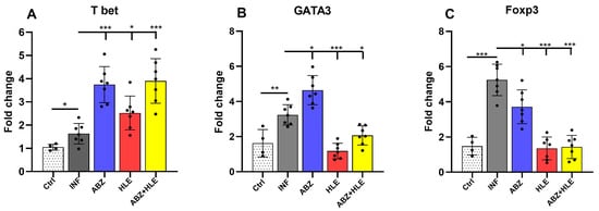 To investigate T cell polarisation, we examined the mRNA expression of lineage-defining transcription factors: Tbet (Th1), GATA3 (Th2), and Foxp3 (Tregs). T-bet, a master regulator of Th1 differentiation, governs IFN-γ expression [], whereas GATA3 promotes Th2 responses and suppresses Th1 lineage factors [] and Foxp3 is necessary for Treg development []. Infected mice exhibited low T-bet expression, which was significantly upregulated in all treated groups, most notably after ABZ and ABZ+HLE therapy (p < 0.001) (Figure 3A). In contrast, both GATA3 and Foxp3 were markedly elevated in infected and ABZ-only groups, while their expression levels significantly declined following HLE and combination therapy (p < 0.001) (Figure 3B,C), indicating a rebalancing of Th1/Th2/Treg responses.