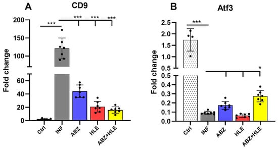 B cells, including the B1 subset, serve as an important source of cytokines and as precursors of plasma cells, playing pivotal roles in coordinating interactions among macrophages, dendritic cells, and T cells []. In another flatworm infection, schistosomiasis, CD9 has recently been identified as a key surface marker for murine IL-10+ CD19+ Bregs involved in infection progression []. In our study, expression of Cd9 was strongly upregulated in B1 cells from infected mice and significantly downregulated in all treated groups, including the ABZ treated mice. This was not entirely consistent with the pattern of Foxp3 expression, suggesting that ABZ may have exerted a more pronounced molecular effect on B cells than on peritoneal T cells. We also found that in comparison with control larval infection strongly downregulated Atf3 gene expression, another transcription factor associated with Breg function, immune regulation, and homeostasis [,] and therapies only moderately modulated mRNA levels.