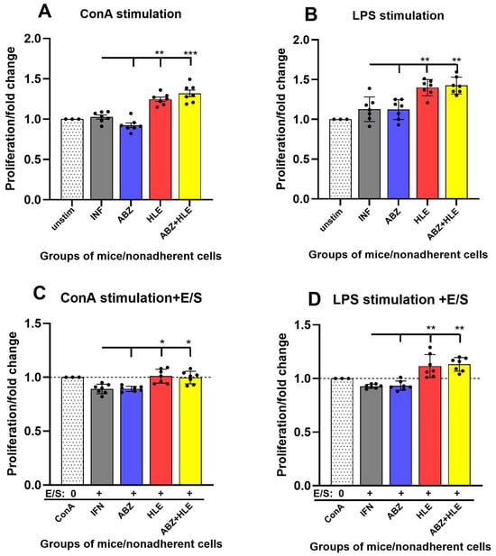 Helminth-derived excretory/secretory (E/S) products are known to modulate host immunity to promote parasite survival []. To assess lymphocyte functionality, we evaluated the proliferative capacity of non-adherent peritoneal lymphocytes ex vivo using BrdU incorporation following 72-h stimulation with ConA (T cell mitogen), LPS (B cell mitogen), or re-stimulation with larval E/S antigens. Cells from infected and ABZ-treated mice exhibited significantly reduced proliferative responses to ConA, indicative of impaired T cell function. In contrast, proliferation was partially restored in the HLE and ABZ+HLE groups (p < 0.001) (Figure 5A). Similarly, LPS-induced B cell proliferation was low in infected and ABZ-treated groups but showed moderate recovery following HLE and combination therapies (Figure 5B). Re-stimulation with E/S antigens led to further suppression of T and B cell proliferation across all groups, with the most profound inhibition observed in the infected and ABZ-only groups. However, cells from the HLE and ABZ+HLE groups displayed a partial restoration of responsiveness despite E/S exposure (Figure 5C,D), suggesting that HLE may mitigate E/S-induced immune hyporesponsiveness through its immunomodulatory components.