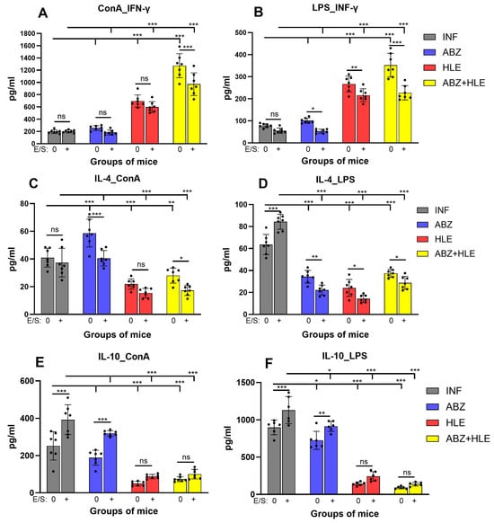 The polarising effects of the treatments on T and B lymphocytes were evaluated by quantifying the canonical Th1/Th2/Treg cytokines IFN-γ, IL-4, and IL-10 in culture supernatants following stimulation with ConA, LPS or re-stimulation with larval E/S antigens. IFN-γ production by ConA-stimulated T cells was low in infected and ABZ-treated mice and significantly increased in the HLE and ABZ+HLE treated groups (p < 0.001), consistent with elevated T-bet expression and proliferative activity (Figure 6A). LPS-stimulated B cells from infected and ABZ-treated mice produced only low levels of IFN-γ, whereas B cells from HLE and ABZ+HLE groups secreted significantly higher levels, though E/S antigens reduced this secretion in all groups. (Figure 6B). Compared to the infected group, IL-4 levels were significantly increased in cultures of ConA-stimulated T cells from ABZ-treated mice (p < 0.001) and were markedly reduced in the HLE and ABZ+HLE groups (Figure 6C). In contrast, LPS-stimulated B cells from infected mice secreted high levels of IL-4, which declined in all treated groups, suggesting differential regulatory effects of ABZ on T and B1 cells (Figure 6D). Notably, IL-4 production was also suppressed in all groups following stimulation with E/S antigens.