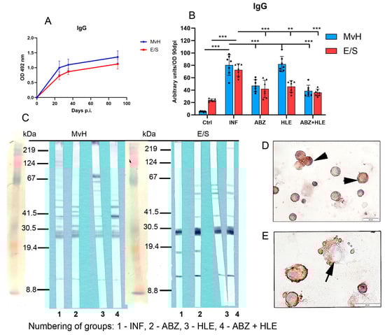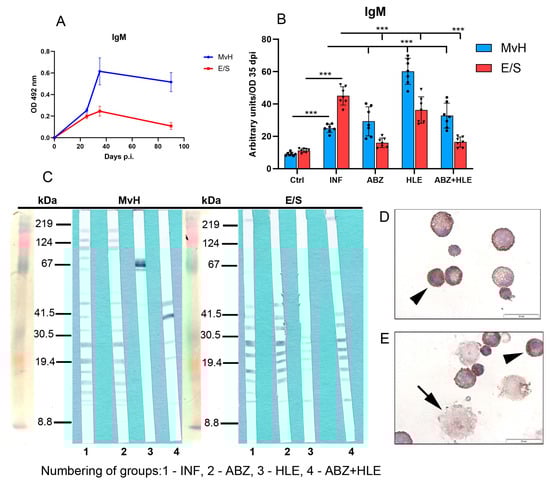 IgM antibody response and immunoreactivity to MvH and E/S antigens in peritoneal exudates of M. vogae infected mice. (A) Kinetics of IgM levels in infected untreated mice showed a peak between days 35 and 40 p.i. (B) IgM antibody levels specific to MvH and E/S antigens in treated groups. Data represent mean ± SEM (means of triplicate analysis) (n = 7); *** p < 0.001. (C) Representative images from Western blot analysis showing revealed distinct immunoreactive profiles for MvH and E/S antigens across treatment groups (1-INF, 2-ABZ, 3-HLE, 4-ABZ+HLE). (D,E) Immunocytochemical staining of non-adherent lymphoid cells with HRP-conjugated anti-IgM antibodies identified IgM-producing plasma cells (arrowhead) and large plasmablast-like cells (arrow) (scale bar = 20 µM).