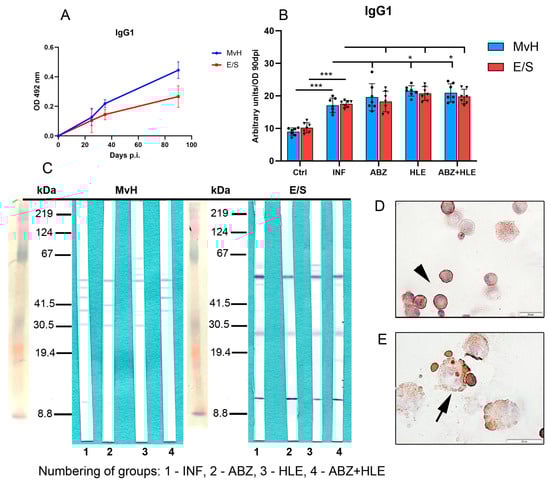 IgG1 antibody levels and antigen recognition patterns in peritoneal exudates. (A) IgG1 levels specific to MvH and E/S antigens on day 90 p.i., expressed in arbitrary units derived from OD values. (B) IgG1 levels to MvH remained unchanged across groups, while E/S-specific IgG1 increased post-treatment. Data represent mean ± SEM (means of triplicate analysis) (n = 7); * p < 0.05, *** p < 0.001. (C) Western blot profiles showing differential IgG1 reactivity to MvH and E/S antigen for individual groups (1-INF, 2-ABZ, 3-HLE, 4-ABZ+HLE). (D,E) IgG1-producing plasma cells (arrowhad) and plasmablasts (arrow) detected by immunocytochemistry (scale bar = 20 µM).