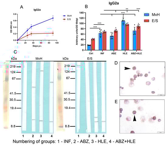IgG antibody levels and immunoreactivity of MvH and E/S antigens in peritoneal exudates. (A,B) Total IgG antibody levels specific to MvH (A) and E/S. (B) Antigens were measured in peritoneal exudates by ELISA. Arbitrary units were calculated from OD values on day 90 p.i. Data represent mean ± SEM (means of triplicate analysis) (n = 7); ** p < 0.01, *** p < 0.001. (C) Representative images from Western blot analysis showing differential profiles of immunoreactive MvH and E/S antigens for individual groups (1-INF, 2-ABZ, 3-HLE, 4-ABZ+HLE). (D,E) Immunocytochemical detection of IgG-producing peritoneal cells showing positive staining in enlarged plasma cells (arrowhead) and a smaller number of plasmablasts (arrows); (scale bar = 20 µM).