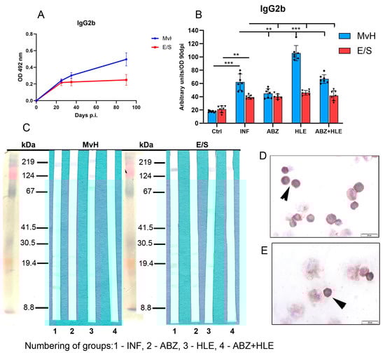 IgG2b antibody response, antigen recognition in peritoneal exudates and antibody secreting cells. (A) IgG2b levels expressed as arbitrary units at day 90 p.i. (B) Effect of infection and treatments on MvH and E/S-specific IgG2b levels. Data represent mean ± SEM (means of triplicate analysis) (n = 7); ** p < 0.01, *** p < 0.001. (C) Western blot detection of MvH and E/S antigens recognised by IgG2b in individual groups (1-INF, 2-ABZ, 3-HLE, 4-ABZ+HLE). (D,E) Representative images of IgG2b-secreting plasma cells (arrowhead), (scale bar = 20 µM).