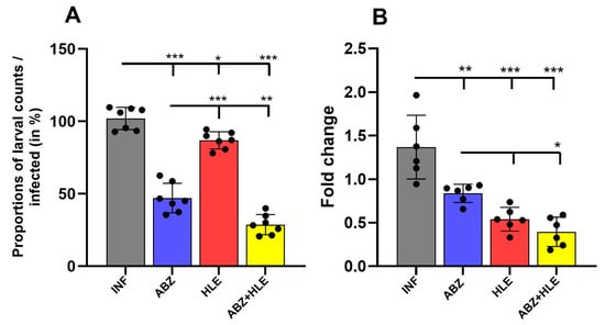 Finally, we found a correlation of drug efficacy on larval biology by measuring expression of the 14-3-3 gene, a cell cycle regulator in eukaryotic organisms, including helminths. Expression was significantly downregulated following therapy, especially in the ABZ+HLE group. Surprisingly, HLE alone also reduced gene expression, potentially explaining its modest larvicidal activity. Similar correlations between 14-3-3 downregulation and parasite mass reduction were observed in E. multilocularis infected mice []. We suppose that suppressed 14-3-3 mRNA expression may not fully account for the inhibition of all larval pro-survival adaptation mechanisms. This could explain the relatively modest reduction in larval burden compared to the effect of ABZ, which acts directly through inhibition of tubulin polymerisation. A deeper investigation of this phenomenon, along with studies on the safety and risks of this adjuvant, could support future research and the development of innovative therapeutic strategies against parasitic diseases.