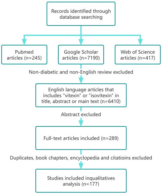 The literature for this study was searched on 10 December 2024, in three electronic research databases: Web of Science (Clarivate Analytics, Philadelphia, PA, USA), Google Scholar (Google LLC, Mountain View, CA, USA), and PubMed (National Library of Medicine, Bethesda, MD, USA). The selection was based on a series of clear inclusion criteria: only research published in English journals must be included, and the keywords “vitexin” and “isovitexin” must be included in the article. The system review excluded review articles, abstracts, editorials/letters, conferences, and conference papers. Articles unrelated to “vitexin” and “isovitexin” in terms of antioxidant, anti-inflammatory, safety, and toxicological applications were also excluded. To further screen the articles, the research results were manually screened to exclude articles that contained duplicate data or were duplicated in the database, as well as some articles on the phytochemical separation of “vitexin” and “isovitexin” derivatives. The remaining articles constituted the main source of information for writing this article. Figure 2 shows the study selection process, through which the researchers ensured the quality and relevance of the included studies to more accurately evaluate the therapeutic potential and health protection of “vitexin” and “isovitexin” in diseases. This systematic approach helps extract the most valuable data from a large amount of work in the literature, providing a scientific basis for further research and clinical applications. Through this process, researchers can provide deeper insights into the use of “vitexin” and “isovitexin” as disease treatment methods and provide guidance for future research.
