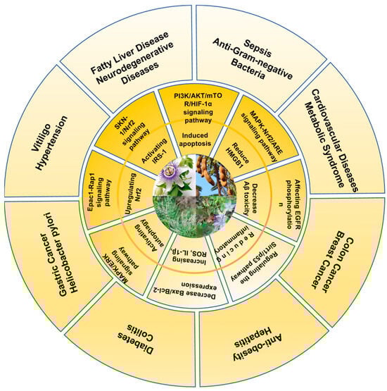 This section highlights the therapeutic effects of vitexin and isovitexin, including cardiovascular protection, blood sugar regulation, anti-obesity, anticancer, antioxidant, anti-inflammatory, and neuroprotective properties. Additionally, they exhibit antimicrobial and antibacterial activities. Table 1 and Figure 3 and Figure 4 illustrate the diseases and treatment types that vitexin and isovitexin can improve, along with their key mechanisms. The yellow inner circle of Figure 3 illustrates the key molecular mechanisms through which vitexin and isovitexin exert their pharmacological effects, while the outer ring shows the corresponding disease conditions or therapeutic areas.