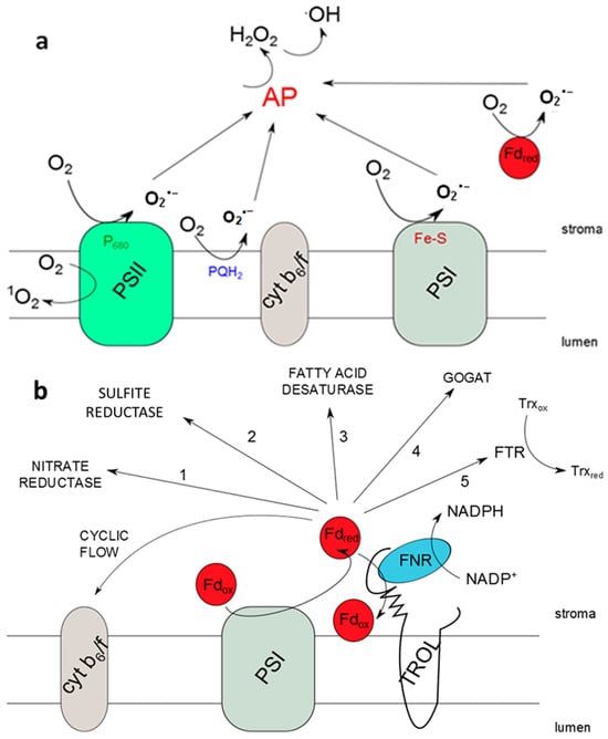 Photosynthetic reactive oxygen species (ROS) propagation, possible electron transfer pathways, and the role of the thylakoid rhodanese-like protein and ferredoxin-NADP+ oxidoreductase (TROL-FNR) pair. (a) ROS propagation sites in the photosynthetic electron transport chain by excitation and reduction of O2; (b) existing electron transfer pathways from reduced ferredoxin (Fdred) in the vicinity of photosystem I (PSI). When FNR is docked to thylakoid membranes by TROL, the linear electron transport pathway is preferred. In the absence of FNR binding to TROL, e.g., in the TROL knock-out (TROL KO) plants, electrons from Fdred can be distributed to some of the alternative pathways. This transfer is more rapid than the linear electron transport pathway, efficiently preventing electron transfer to O2 and consequently causing lower superoxide anion (O2·−) propagation. Dynamical binding of the TROL-FNR protein pair influences the distribution of electrons in different pathways depending on energy status and needs of the cell.