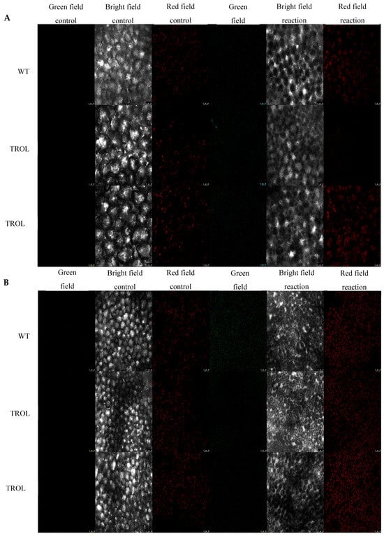 Plants were 4 weeks old for the normal moisture conditions and 6 weeks old for the drought stress conditions. Morphologically, under normal moisture conditions leaves were of healthy green color with bigger rosettes in mutant lines than in WT. Under drought stress TROL KO plants had bigger rosettes of green color, while WT displayed a reddish color from accumulated anthocyanins. Morphological characteristics of TROL ΔRHO were in between TROL KO and WT. All sampled leaves were at the fully developed stage. Plants of each line were put in the dark 2 h before the experiment. The whole leaf was cut out from the plant and rinsed in 50 mM HEPES buffer (pH 7.5) and after that incubated for 30 min in the desired fluorescent probe (250 µM DHE, 50 µM Spy-LHP, or 50 µM SOSG), while control samples were incubated in 50 mM HEPES buffer. After incubation, the leaf was again rinsed in 50 mM HEPES buffer and transferred onto a glass slide in a drop of 50 mM HEPES buffer and covered with a cover glass. The protocol was modified according to Prasad et al. [14].