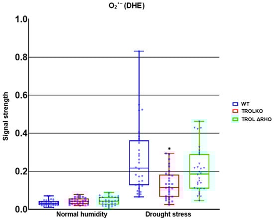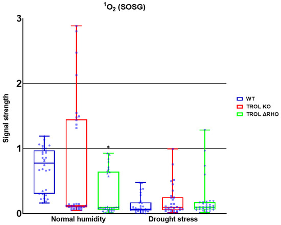 For the 1O2, only significant reduction can be noticed under the conditions of normal growth substrate moisture, contrary to the previous results. The amount was significantly reduced in the TROL ΔRHO mutant line in comparison with the WT (Figure 4 and Figure 7). Neither of the mutations shows a protective role against 1O2 under the drought stress conditions (Figure 4 and Figure 7).