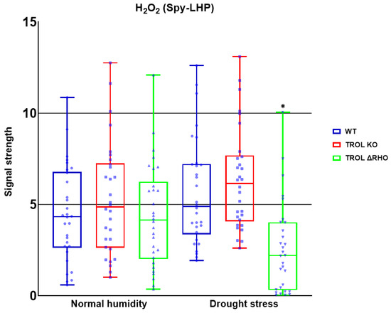Confocal laser scanning microscopy signal strength detection results for hydrogen peroxide. The distribution of all obtained results is shown. The statistically significant decrease in the H2O2 amount in the ΔRHO mutant line under the drought stress condition indicates the defensive role of the TROL ΔRHO domain against H2O2 by transmembrane signal transduction, which influences the thylakoid rhodanese-like protein and ferredoxin-NADP+ oxidoreductase (TROL-FNR) complex dynamical binding and TROL complex formation with tAPX. Statistical significance indicated as * at a p < 0.05 confidence level.