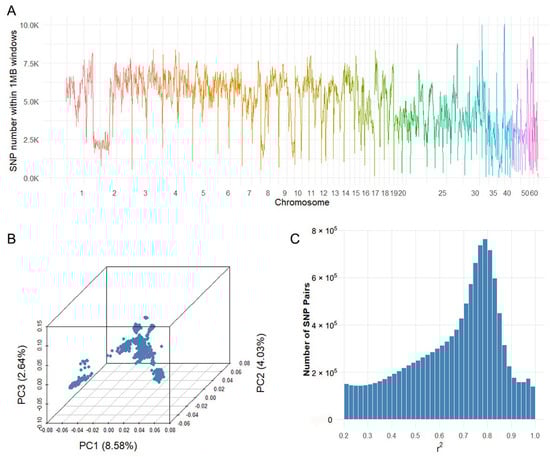(A) Distribution of single nucleotide polymorphism (SNP) density. Different colors represent different chromosomes; (B) principal component analysis (PCA) of the first three principal components; (C) linkage disequilibrium (LD) r2 histogram (r2 > 0.2).
