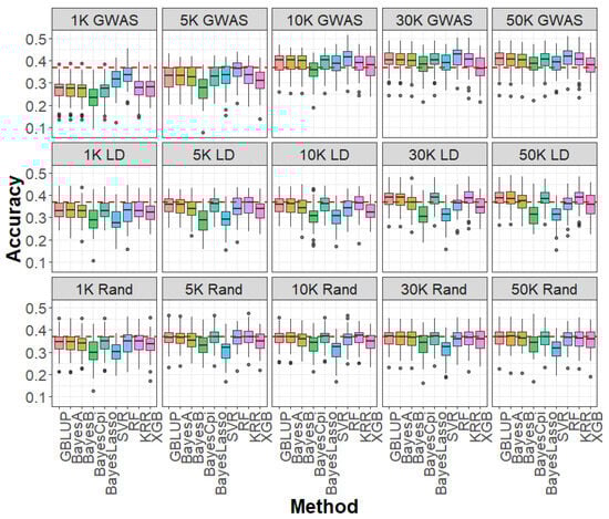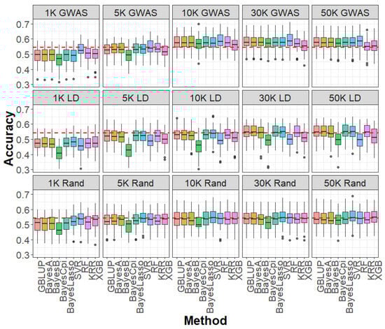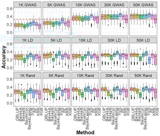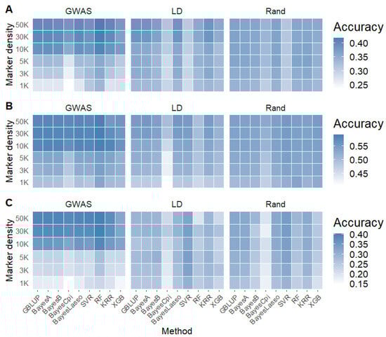 For each strategy, SNP panels of varying densities (1 K, 3 K, 5 K, 10 K, 30 K, and 50 K) were constructed. The upper limit of 50 K was selected based on our previous findings, which indicated that a density of 50 K SNPs is sufficient to achieve high prediction accuracy in this population []. These SNP sets were then used to compare the impact of marker selection strategy and density on the accuracy of genomic prediction.