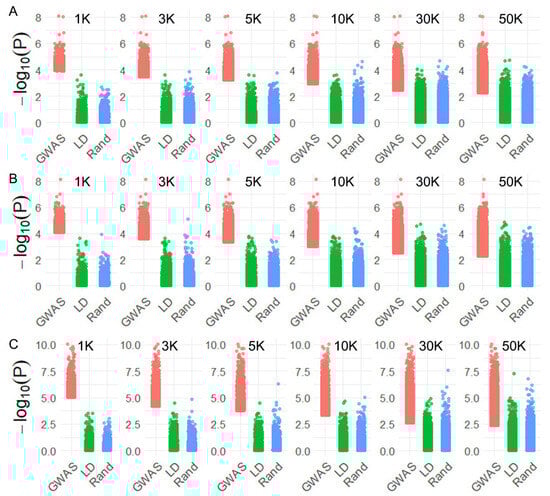 Previous studies have indicated that directly utilizing all available markers from WGS data does not necessarily improve, and may even reduce, the accuracy of genomic prediction, due to the inclusion of redundant, low-frequency, or non-informative variants. For example, Perez-Enciso et al. [] demonstrated through simulation that adding all sequence variants could deteriorate prediction accuracy by introducing noise. In Japanese flounder, Lu et al. [] showed that pre-selecting informative SNPs outperformed models using the full WGS dataset for disease-resistance traits. Similarly, Zhang et al. [] reported that using all WGS variants did not consistently outperform lower-density SNP chips for predicting feed efficiency in pigs. Building on this understanding, we implemented three distinct SNP selection strategies—GWAS-based prioritization, linkage disequilibrium (LD) pruning, and random sampling—to remove uninformative markers and reduce redundancy. Among them, GWAS-based selection consistently achieved higher predictive accuracies at moderate to high SNP densities (≥10 K) across all three traits examined. This may be attributed to the greater SNP-trait associations (smaller p-values) selected by the GWAS-based selection strategy (Figure 6). This trend aligns with findings in other aquaculture species such as rainbow trout [] and Asian seabass [], where the prioritization of trait-associated SNPs has been shown to capture a greater proportion of phenotypic variance, thereby facilitating more accurate genomic predictions (Table 2). However, a critical challenge in GWAS-guided genomic selection lies in determining the appropriate number of SNPs to include. Our previous work in four aquaculture species demonstrated that using only genome-wide significant SNPs (selected by false discovery rate thresholds) combined with GFBLUP models did not consistently enhance prediction accuracy []. Similar findings were reported by Vu et al. [], suggesting that a limited number of highly significant SNPs may not capture sufficient genetic variance. In the present study, by systematically varying SNP density from 1 K to 50 K, we observed that low-density panels failed to maintain predictive power, whereas higher-density panels (≥10 K) significantly improved performance. These results highlight the importance of selecting a sufficiently large set of SNPs when applying GWAS-based strategies to maximize the benefits for genomic prediction.