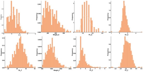 Frequency distribution histograms of the eight phenotypes. SL represents body length, Weight represents body weight, FC refers to the fat content of the fillet, CF stands for condition factor, and S and F refer to spring and autumn, respectively.