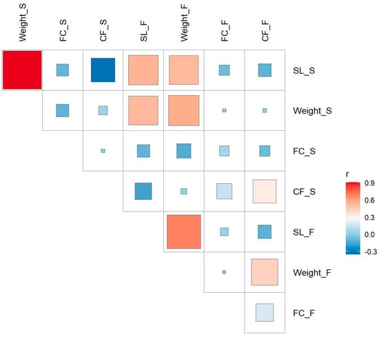 Phenotypic correlation heatmap between different traits in spring and autumn. Each cell shows the Pearson correlation coefficient (r value) between two traits, with the color representing the strength and direction of the correlation. Red indicates a positive correlation, blue indicates a negative correlation, and darker colors represent stronger correlations. The larger boxes highlight groups of traits with particularly strong correlations (|r| > [threshold value. The traits in the figure include body length (SL), body weight (Weight), fat content of the fillet (FC), and condition factor (CF), where “S” refers to spring and “F” refers to autumn.