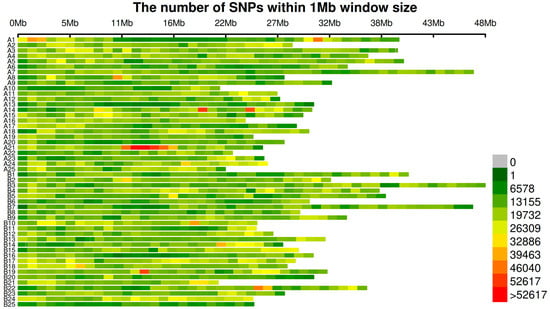 The figure shows the number of SNPs within a 1 Mb window size across different chromosomal regions. Each row represents a distinct chromosomal region, with the X-axis indicating different chromosomal intervals (from 0 Mb to 48 Mb). The color gradient reflects the number of SNPs within each interval, ranging from green (low SNP count) to red (high SNP count). The figure highlights the distribution of SNPs across the genome, identifying regions with higher SNP density. The color scale on the right indicates the corresponding SNP count range for each color.