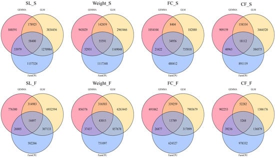 Overlap of significant SNPs identified by three GWAS methods for four traits across two seasons. The number of SNPs with p-values less than 0.05 detected by three GWAS methods (GEMMA in pink, GLM in yellow, and FarmCPU in blue) is shown using Venn diagrams. The traits include body length (SL), body weight (Weight), fillet fat content (FC), and condition factor (CF), with “S” representing spring and “F” representing autumn.