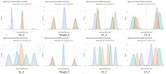 To explore the stability and consistency of different GWAS methods in estimating effect sizes, the performance of each method on different traits was compared. As shown in Figure 5, this plot presents the density distribution of β effect sizes for significant SNPs (p-value < 0.05) across eight traits, as estimated by each GWAS method (GEMMA, GLM, and FarmCPU). Each subplot represents the distribution of β effect sizes for different traits (body length (SL), body weight (Weight), fat content of the fillet (FC), and condition factor (CF)) in both spring (S) and autumn (F). The x-axis represents the signed log(β effect size), while the y-axis shows the corresponding density.