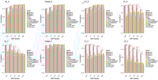 Results of genomic selection across 11 models following GWAS analysis using FarmCPU. The plot shows the correlation results for SNPs selected based on p-values, with SNP densities of 500, 1K, 5K, 10K, and 50K. Each model is represented by a different color, illustrating the performance of genomic selection at various SNP densities for different models.Traits include body length (SL), body weight (Weight), fillet fat content (FC), and condition factor (CF), with “S” indicating spring and “F” indicating autumn.
