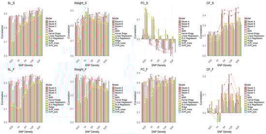 Results of genomic selection across 11 models following GWAS analysis using GEMMA. The plot shows the correlation results for SNPs selected based on p-values, with SNP densities of 500, 1K, 5K, 10K, and 50K. Each model is represented by a different color, illustrating the performance of genomic selection at various SNP densities for different models. Traits include body length (SL), body weight (Weight), fillet fat content (FC), and condition factor (CF), with “S” indicating spring and “F” indicating autumn.