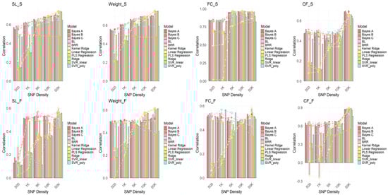 To further analyze the impact of combining genomic selection (GS) models with the three GWAS methods (FarmCPU, GEMMA, and GLM) on the genomic selection performance, the combination of these GWAS methods with 11 GS models (including Bayes A, Bayes B, Bayes C, BL, BRR, Kernel Ridge, Linear Regression, PLS Regression, Ridge, SVR linear, and SVR poly) was evaluated under the condition of selecting 5000 single-nucleotide polymorphisms (SNPs). As shown in Figure 9, the prediction accuracy for four traits (body length (SL), body weight (Weight), fat content of the fillet (FC), and condition factor (CF)) in both spring (S) and autumn (F) is presented. The results indicate that the combination of the FarmCPU method with multiple genomic selection (GS) models, such as Bayes A, Bayes B, and SVR_linear, consistently delivers the most stable and accurate performance across most traits. This approach shows a particularly high correlation at elevated SNP densities (e.g., 5K), providing reliable selection outcomes. Notably, for the FC_S trait, the prediction accuracy reaches up to 0.95, highlighting its effectiveness in the genomic prediction. In contrast, the combination of GEMMA with certain GS models (such as Kernel_Ridge and Ridge) performed relatively weakly for some traits, especially for the fat content of the fillet (FC), where its performance was inferior to that of FarmCPU. Furthermore, the performance of the GLM method was more variable, particularly at lower SNP densities, where its combination with some GS models showed poor results. Overall, the combination of FarmCPU with GS models provided the most stable and efficient results for genomic selection, particularly for traits with more complex genetic variation.