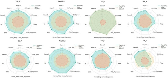 Analysis results of different GWAS and genomic selection (GS) model combinations using 5K SNPs. The radar charts illustrate the performance of 11 different models across eight traits (SL_S, Weight_S, FC_S, CF_S, SL_F, Weight_F, FC_F, and CF_F) based on the selected 5000 SNPs. The three methods (FarmCPU, GLM, and GEMMA) are compared to visualize the correlations across each model’s performance.