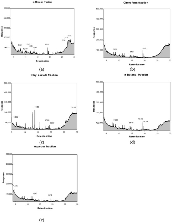 2.7. Comprehensive Gas Chromatography–Mass Spectrometry Detection GC–MSD Analysis of Solvent Fractions from P. cuspidatum