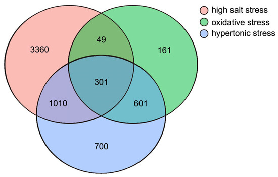 Each stress sample was compared with the control group to identify the DEGs (log2 (fold change) > 1, p-value < 0.05). The highest number of DEGs was identified in the high salt-stress sample, with 4720 (1756 up- and 2964 down-regulated), 1111 DEGs (100 up- and 1011 down-regulated) were identified in the oxidative stress sample and 2611 DEGs (383 up- and 2228 down-regulated) were detected in the hypertonic stress sample (Figure 1 and Figure 2 and Table S3).