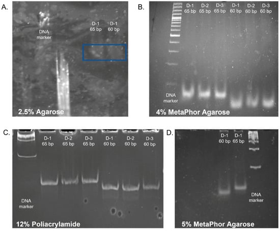 A qualitative assessment of the separation of 60, 65 bp samples, and the separation was performed in: (A) 2.5% agarose gel (samples were mark by box); (B) 4% MetaPhor™ high-resolution agarose, Lonza; (C) 12% polyacrylamide gel; (D) 5% high-resolution MetaPhor™ agarose (D-1; D-2; D-3-technical replicates).