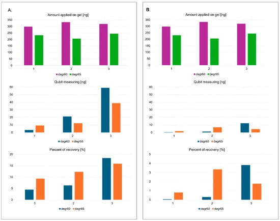 The solution was enriched by adding glycogen due to the low concentration of fragments in the obtained filtrates. Glycogen is a polysaccharide that can effectively co-precipitate with DNA in alcohol, such as ethanol or isopropanol. It aggregates with DNA, increasing the weight of the molecules and facilitating precipitation []. For samples with low DNA concentrations, adding glycogen notably increases the efficiency of the precipitation procedure. Low-concentration DNA can be challenging to precipitate, but glycogen helps form larger, more easily centrifuged aggregates. Thus, even minimal amounts of DNA can be recovered, which might be left in the supernatant without glycogen []. Due to their low efficiency for fragments less than 70 bp in length and low initial concentration, none of the commercially available agarose gel elution kits were used. Three methods were tested for eluting and precipitating degradome library fragments after agarose and polyacrylamide gel electrophoresis, i.e., freeze and squeeze method in a glycogen-containing solution, centrifuged in a gauze-containing tube with standard eluent without glycogen, and centrifuged in a gauze-containing tube with a solution enriched with glycogen. The concentration of the DNA fragments was measured before electrophoresis and after elution from the gel using a Qubit fluorimeter and a dsDNA HS Assay Kit (Agilent , Santa Clara, CA, USA). Based on the results, the highest sample recovery of ~20% was obtained using the third method from agarose gel (Figure 2). The efficiency of elution from the polyacrylamide gel was undoubtedly influenced by the type of buffer used. It is standard practice to use high ionic strength buffers containing EDTA in their composition for elution [,]. However, the presence of EDTA in samples undergoing next-generation sequencing (NGS) is unfavorable due to the inhibition of MG2+ ion-dependent enzymes, such as ligase and polymerase. This can contribute to incomplete or inefficient amplification and ligation, resulting in lower sequencing yield with compromised quality [,]. Due to the low concentration of DNA fragments, EDTA could not be removed by further purification steps.