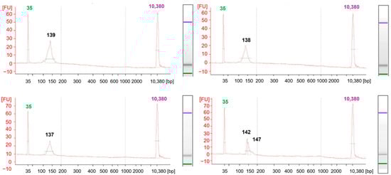 PCR-amplified libraries were purified using 4% MetaPhor™ high-resolution agarose gel (Lonza, Basel, Switzerland). Custom-size markers of 60 and 65 bp, generated by amplifying an ADP-ribosylation factor fragment (GenBank accession number 838957), facilitated precise excision of the target DNA smear. DNA fragments were subsequently recovered by centrifugation through gauze-lined tubes, followed by ethanol precipitation in the presence of sodium acetate and glycogen. For comparative evaluation, alternative separation and purification methods were also assessed, including electrophoresis in 2.5 agarose gel, 5% MetaPhor™ high-resolution agarose gel, and 12% polyacrylamide gel, as well as freezing gel fragments in the presence of glycogen and centrifuging on gauze without glycogen. The quality and size distribution of the final libraries were confirmed using an Agilent 2100 Bioanalyzer, and library concentrations were determined by Qubit fluorometry.
