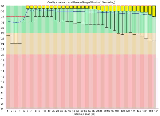 During the analysis, 130–150 bp libraries were confirmed in size using Bioanalyzer 2100 automatic electrophoresis (Figure 5). Using the Mme I enzyme in the method, and a highly effective purification technique involving centrifugation, allows the generation of libraries sequenced as 36 bp. This approach offers a substantial cost reduction compared to conventional protocols. The approach, suggested by Carpentier, for sequencing long fragments of around 150 bp results in higher analysis costs []. Shorter reads noticeably reduce the data required for high coverage of the cut sites, which is essential for degradome-seq analyses. In this type of study, key information is concentrated at the 5′ ends of the degradation sites. Long continuous reads are not required []. Following the steps described in the protocol, the constructed library produced 25 million single reads using MiSeq Reagent Kit v3 (Illumina, Inc., San Diego, CA, USA). As a result of sequencing, 7791.680, 7858.994, and 6797.471 raw reads were obtained. The high quality of the reads (Figure 6) was confirmed by evaluating the reads obtained during sequencing using FastQC []. The parameter indicating the quality of the sequencing (QC) was 98.5%. The qualitative analysis of the raw reads indicated their high quality.