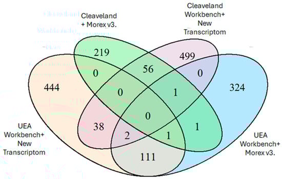 The developed protocol has been used to verify targets for miRNAs detected in dry seeds and during the first 24 h of germination of barley seeds after long-term storage. Further research aims to identify the relationship between germination capacity and miRNAs and seed aging processes. The presented protocol was applied to degradome sequencing analyses of barley seeds during germination, as the sequencing identified potential target genes for miRNAs identified in the study. Figure 7 shows the number of identified degradome sequences mapped to miRNAs, depending on the chosen bioinformatics analysis method. The highest number of identified sequences was obtained using an analysis algorithm based on the CleaveLand 4.0 program and an in-house assembly of the Hordeum vulgare cultivar Damazy transcriptome (596 sequences). Using the UEA Workbench analysis algorithm and the new transcriptome assembly, an identical value of 591 sequences was also obtained.