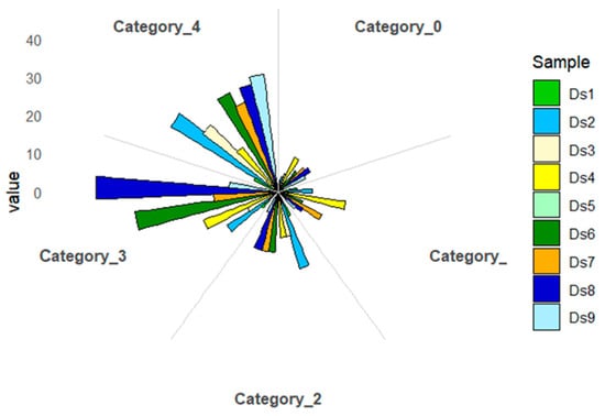 The identified degradome sequences were evaluated for class membership based on the number of reads in a given transcript position. (Figure 8). Category 0 includes positions with >1 read, the only maximum in a given transcript, indicating the highest specificity and reliability. Category 1 contains positions with >1 read that co-occur with other positions with the same maximum number of reads, indicating parallel cuts at different mRNA sites. Category 2 includes positions with >1 read that exceed the average number of reads for the transcript, but not the maximum, indicating moderate experimental support. Category 3 is assigned to positions with >1 read equal to or below the average, indicating low confidence, often associated with technical noise or poor target expression. Category 4 includes positions with only one read, which are the least reliable and may represent artifacts. As a result of categorizing the sequences assigned to the cutting sites, more than 25% of the reads matched to category 4 were observed in all the studied samples. About 20% of the sequences in each sample studied were matched to category 3, except sample D5. The most significant number of reads matched to category 0 was identified in samples D4 and D9 (13%) and D1 and D7 (11%).
