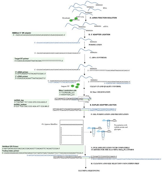 To enable the efficient analysis of the RNA degradome in low-quality samples, a modified degradome-seq library preparation protocol was developed and implemented. This protocol is based on optimizing existing procedures and reusing reagents from the small RNA analysis kit. The procedure involves steps from isolating mRNA fractions to acquiring finished libraries suitable for sequencing on the Illumina platform. To clarify the method and allow it to be replicated, Figure 9 shows a complete flowchart of degradome library preparation, visualizing the subsequent steps of the protocol, including adapter ligation, cDNA synthesis, enzymatic restriction, fragment purification, and final amplification. The whole protocol is described in detail in Supplementary Materials S1. All necessary reagents and equipment are listed in Supplementary Materials S2.