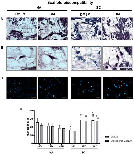 Scaffold biocompatibility was assessed based on the ability of hASCs to adhere and invade the bone-like single-layer SC1 and HA scaffolds. Data were gathered at 14, 28 and 46 days after cell seeding from three independent experiments, each performed in triplicate. Figure 2 shows results obtained after hematoxylin/eosin (A) and DAPI (B) staining. It was found that hASCs were able to infiltrate into and survive in the scaffolds in both experimental culture conditions: Dulbecco’s modified Eagle’s medium (DMEM) or osteogenic medium (OM). The enlargements below the microphotographs more clearly show cells inside the scaffolds. Nuclei counts (C) revealed that the number of cells invading the scaffolds was not significantly different when comparing DMEM vs. OM for the same type of scaffold at the same time points, whereas differences were observed between SC1 vs. HA. Increased cell populations were found when cells were grown in SC1, comparing cell counts at 28 and 46 days to those at 14 days.
