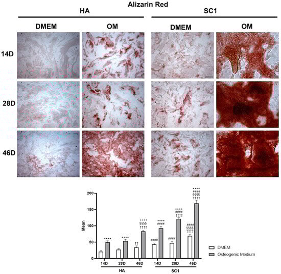 The osteo-inductive ability of the two types of scaffolds (HA and SC1) was evaluated by monitoring osteoblast differentiation of hASCs seeded in the scaffolds. For this purpose, Alizarin Red S staining (which reveals the extracellular matrix calcium) [,] and the immunoexpression of osterix and osteonectin (typical osteoblast markers) were tested. Data were gathered from three independent experiments, each performed in triplicate. Although to different extents, Alizarin Red S staining gradually increased in a time-dependent manner under all conditions (Figure 3), both in DMEM and in OM, at 14, 28 and 46 days after cell seeding. In HA scaffolds, when hASCs were cultured in DMEM, the weak staining present at day 14 was increasingly pronounced at day 28 and 46. As was expected, more intense staining was detected at each time point with OM. In SC1 scaffolds, significantly darker staining was observed in both culture conditions and at the different time points. The histograms in Figure 3 show an average increase of 100% at any time point with either DMEM or OM. In particular, the mineralization process visible in DMEM indicates that SC1 is able per se to stimulate hASC osteogenic differentiation; this process was strongly enhanced with OM.