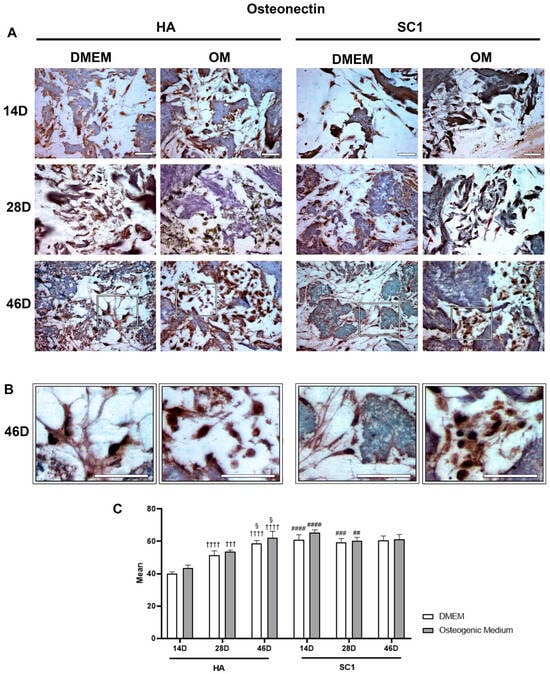 Photomicrographs showing osteonectin immunostaining of HA and SC1 scaffolds. Results were gathered at the different time points (14, 28 and 46 days) after hASC seeding, either in basal DMEM or in osteogenic medium (A). Some enlargements at 46 day of culture for each condition are reported in panel (B). Both the images and the quantitative measurements (histograms in (C)) show that in basal conditions, a significant increase in expression is detectable when hASCs were seeded in SC1. In particular, osteonectin expression in HA increased over time (28 and 46 days), either when hASCs were cultured in DMEM or OM. A different trend could be observed for SC1. The high marker expression present at 14 days is largely maintained at longer detection times. Scale bars: 50 µm. No significance was found comparing OM vs. DMEM for the same type of scaffold at the same time points. Significant differences were instead observed when comparing SC1 vs. HA: # SC1 vs. HA, for the same treatment at the same time point (## p < 0.01, ### p < 0.005, #### p < 0.001); † vs. 14 days, for the same scaffold and the same treatment (††† p < 0.005, †††† p < 0.001); § vs. 28 days, for the same scaffold and the same treatment (§ p < 0.05). For each experimental condition, values are reported as the mean ± SD. Statistical analysis was performed via three-way ANOVA (n = 18). Abbreviations: hASC = human adipose-derived mesenchymal stem cell; HA = hydroxyapatite scaffold; SC1 = scaffold functionalized with phage clones; DMEM = Dulbecco’s modified Eagle’s medium; OM = osteogenic medium.