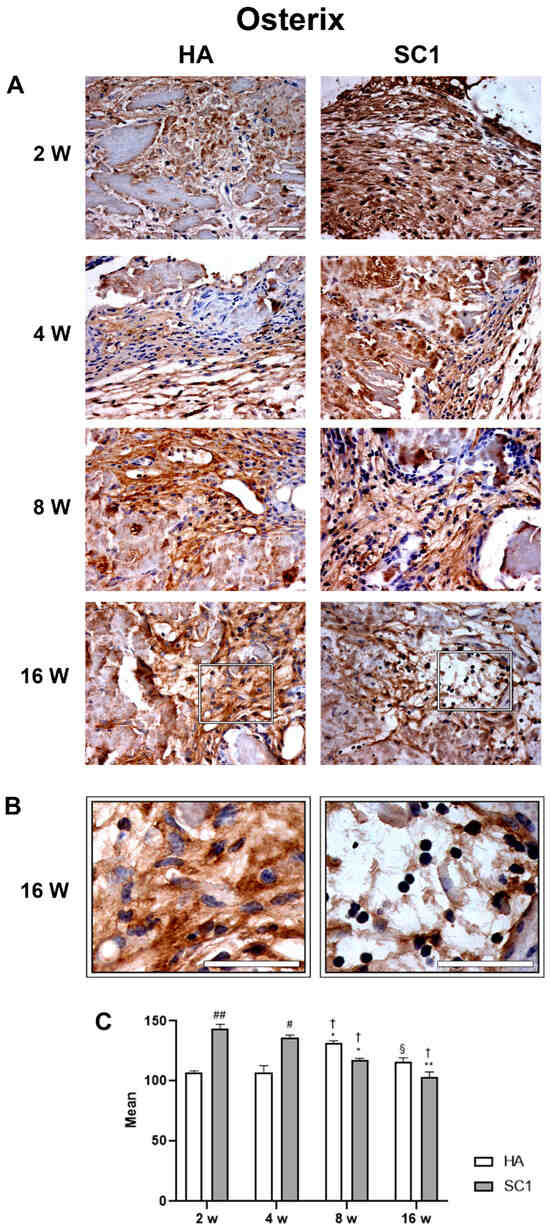 The osteo-inductive ability of the two types of scaffolds (HA and SC1) was evaluated ex vivo via an immunohistochemical analysis of osterix and osteonectin at 2, 4, 8 and 16 weeks after their subcutaneous implantation into the backs of mice. Data obtained largely corroborate those observed in vitro. In particular, osterix expression (Figure 6) detected at 2 weeks in HA, progressively increased up to 8 weeks, showing a decline at the last detection time (16 weeks).