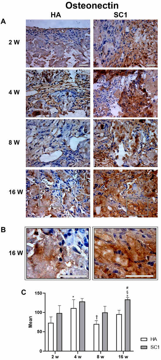 Osteonectin expression showed a similar trend in both HA and SC1, but was consistently stronger in SC1 (Figure 7). In particular, an initial increase was found in both scaffolds between weeks 2 and 4, followed by a reduction at week 8 and a further increase at week 16. However, osteonectin expression was consistently higher in SC1 (+35%, already at 2 weeks).