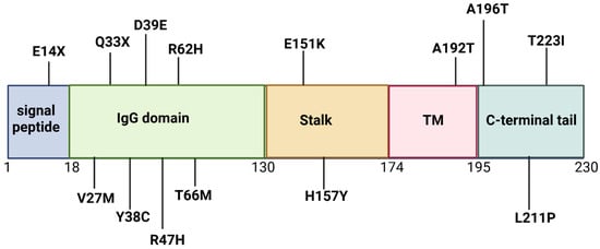 - Kober, D.L.; Alexander-Brett, J.M.; Karch, C.M.; Cruchaga, C.; Colonna, M.; Holtzman, M.J.; Brett, T.J. Neurodegenerative disease mutations in TREM2 reveal a functional surface and distinct loss-of-function mechanisms. Elife 2016, 5, e20391. [Google Scholar] [CrossRef]