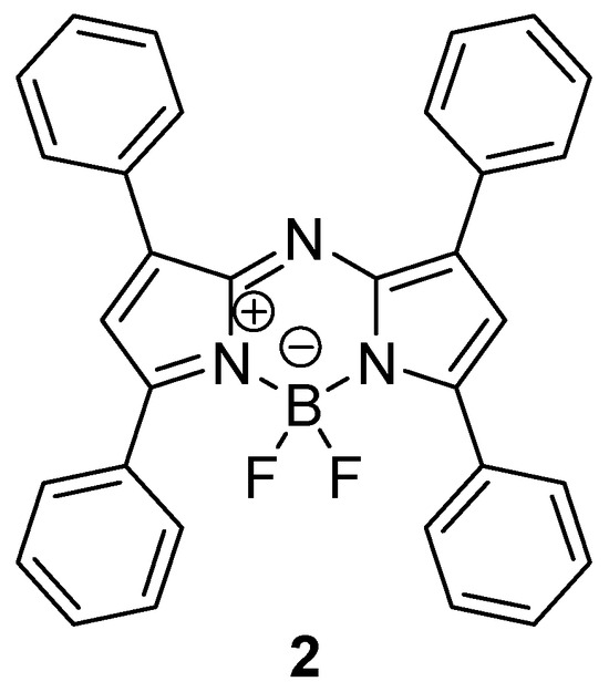 A stirred solution of compound 7 (105 mg, 0.23 mmol) in toluene (3 mL) was treated with triethylamine (0.32 mL, 10 equiv.). The solution was stirred at rt for 15 min, then BF3·OEt2 (0.43 mL, 15 equiv.) was added dropwise and the solution was stirred under reflux for 5 h. After cooling to rt, the reaction was quenched using water (10 mL) and extracted with toluene (3 × 10 mL). The combined organic layers were dried over sodium sulfate and the solvent was removed under reduced pressure. The residue was purified by flash chromatography with 30% CH2Cl2/70% hexanes as an eluent. Compound 2 was obtained as a dark red solid (110 mg, 95%). Mp = 220.2–223.0 °C, Rf = 0.40b. Compound 2 was identical to the compound described in the literature [18,36]. 1H NMR (500 MHz, CDCl3) δ 7.05 (s, 2H), 7.42–7.50 (overlapping multiplets, 12H), 8.04–8.08 (overlapping multiplets, 8H).