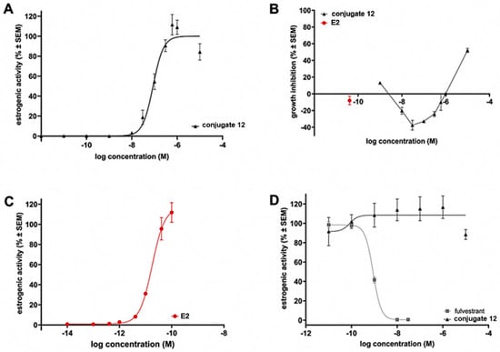 (A) The effect of aza-BODIPY–E2 conjugate 12 on the ER-mediated transcription in the luciferase reporter model. (B) Growth inhibition of conjugate 12 and E2, measured by MTT assay. (C) Estrogenic activity of reference E2 in the luciferase reporter model. (D) Antiestrogenic effect of conjugate 12 and fulvestrant (in the presence of E2) as reference.