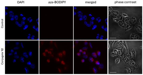 Fluorescent confocal microscopy experiments were performed on ER + T-47D cells to investigate the cellular localization of aza-BODIPY–E2 conjugate 12 (Figure 4). After 4 h treatment of T-47D cells with 10 µM conjugate 12, the red fluorescence was observed both in the cytosol and within the cell nuclei. The results clearly indicate a massive uptake of the aza-BODIPY–E2 conjugate by T-47D cells. Furthermore, the nuclear entry of conjugate 12 could also be verified based on the red fluorescence observed not only in the cytosol but in the nuclei as well, albeit nuclear localization was of slightly less extent than cytosolic accumulation.