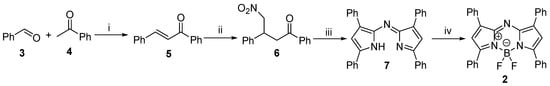 Reagents and conditions: (i) NaOH (2 equiv), methanol, rt, 2 h; (ii) catalytic amount of NaOH, methanol, nitromethane (5 equiv), 60 °C, 3 h; (iii) NH4OAc (20 equiv), 100 °C, 3 min, microwave irradiation (MW); (iv) Et3N (10 equiv), toluene, rt, 15 min, BF3.OEt2 (15 equiv), reflux, 5 h.