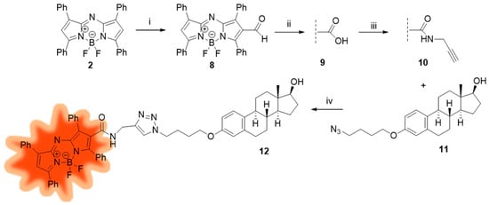 Certain E2-BODIPY conjugates, labeled mainly at position 17α, are described in the literature [14,15]. Nevertheless, only a few E2-aza-BODIPY conjugates were synthesized [16]. Labeling was performed at position 17α via Sonogashira coupling of 17α-ethynylestradiol and the iodophenyl counterpart of tetraphenyl aza-BODIPY. Estrogenic effects of the latter conjugates have not been investigated. An explanation for the lower number of aza-BODIPY estrogen derivatives in the literature may be the later development and less efficient synthesis of the aza-BODIPY scaffold.